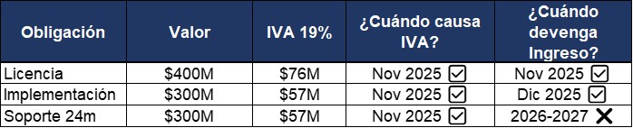 El problema: Los $57M de IVA del soporte ya se causaron en 2025, pero el ingreso se devengará en 2026-2027.